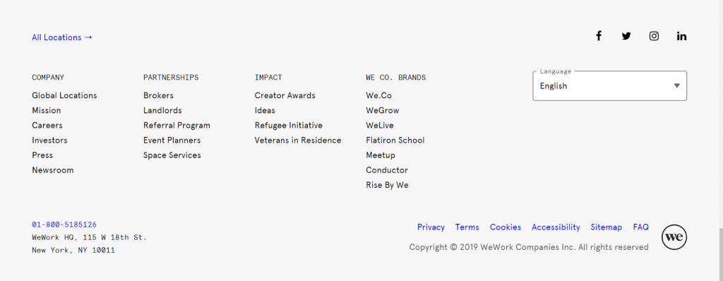 Ta stopka nie musiała wymieniać lokalizacji 10 adresów. Link do lokalizacji i krótki opis wystarczyłyby. Jeśli masz ponad 3 lokalizacje, oto przykład od WeWork, który ma wiele lokalizacji.