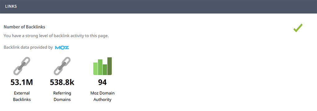 Możesz sprawdzić autoryzację domeny dowolnej strony internetowej, uruchamiając darmowe Audyt SEO. Przewiń w dół do nagłówka "Links" w sekcji SEO, a zobaczysz autorytet domeny strony - który jest liczbą między 1 a 100. Każda strona z wynikiem DA powyżej 60 jest świetnym potencjalnym partnerem. Strony z wynikiem DA powyżej 80 są doskonałe. Jeśli uda Ci się nawiązać kilka partnerstw z wysokiej jakości stronami internetowymi, które zgodzą się linkować do Twojej strony i artykułów - jesteś na drodze do sukcesu! Sprawdź nasz pełny przewodnik na temat linki zwrotne i jak możesz zdobyć ich więcej.
