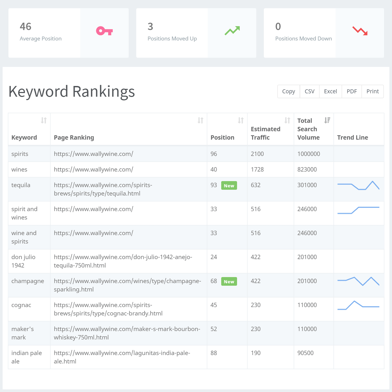Użyj naszego narzędzia do śledzenia słów kluczowych, aby zbadać "całkowitą liczbę wyszukiwań" dla każdego terminu wyszukiwania. Jest to miesięczna liczba wyszukiwań przeprowadzonych w Google. "Szacowany ruch" pokazuje miesięczny szacowany ruch na Twoją stronę w rankingu w oparciu o Twoją "pozycję" na stronie wyników wyszukiwania (SERP). Na przykład, pozycja 1 oznaczałaby, że strona w rankingu jest wymieniona jako pierwszy wynik na stronie 1 - świetny wynik! Pozycja 96 oznaczałaby, że Twoja strona w rankingu jest wymieniona gdzieś na stronie 9 lub dalej - nie jest to idealne.