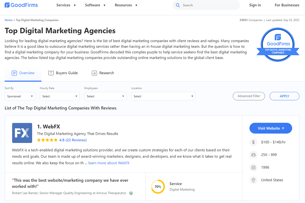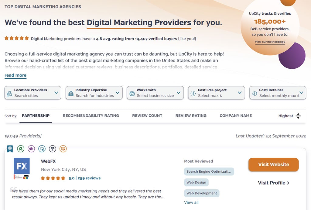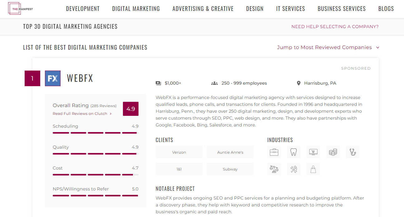 Zauważysz, że WebFX zdaje się zajmować pierwsze miejsce w rankingu agencji cyfrowych na wszystkich 4 stronach z recenzjami. Ale gdy przyjrzysz się bliżej, wszystkie 4 pozycje są sponsorowane, co jest domyślnym porządkiem sortowania na wszystkich tych stronach z recenzjami i sposobem na monetyzację ich wpisów. Oznacza to, że ta agencja płaci spore pieniądze, aby być wyświetlana jako pierwsza na wszystkich tych stronach.