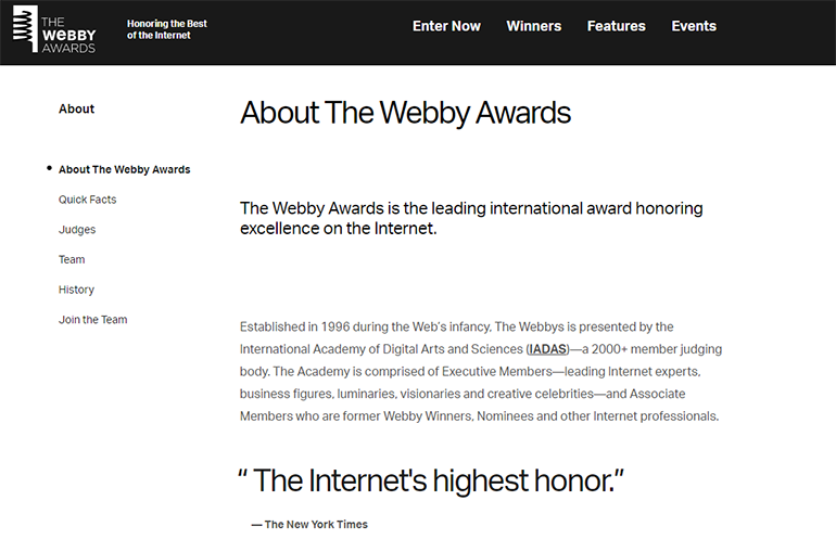 The Webby Awards zostały założone w 1996 roku, w czasach internetu dial-upowego. Organizowane przez IADAS (International Academy of Digital Arts and Sciences), Webbys są wiodącymi międzynarodowymi nagrodami honorującymi doskonałość w sieci. Webbys są oceniane przez 2000-osobowe jury składające się z czołowych cyfrowych marketerów, biznesmenów, wizjonerów i profesjonalistów internetowych.