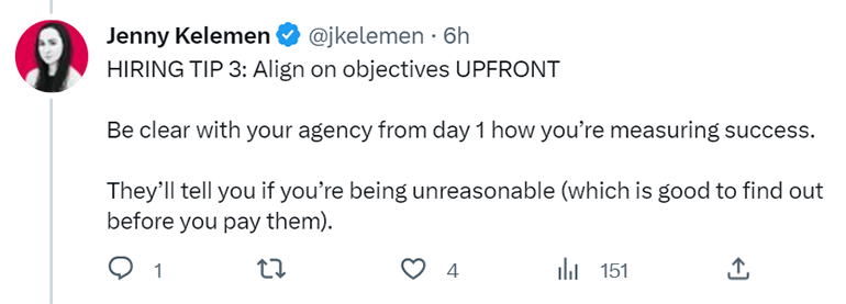 (Na marginesie, sprawdź doskonały wątek na Twitterze Jenny Kelemen na temat 6 lekcji, których nauczyła się podczas zatrudniania i zwalniania agencji).