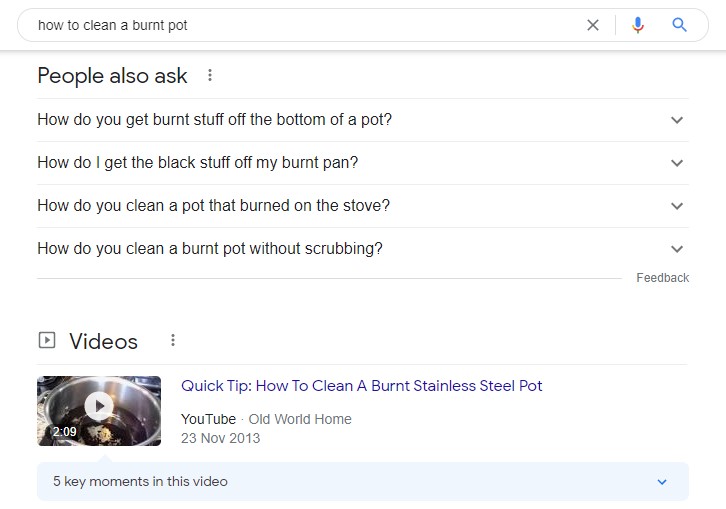 SERP, ayrıca ücretli listeler, öne çıkan snippet'lar, video sonuçları, ilgili aramalar ve "People also ask" kutuları gibi diğer SERP özelliklerini de içerir.