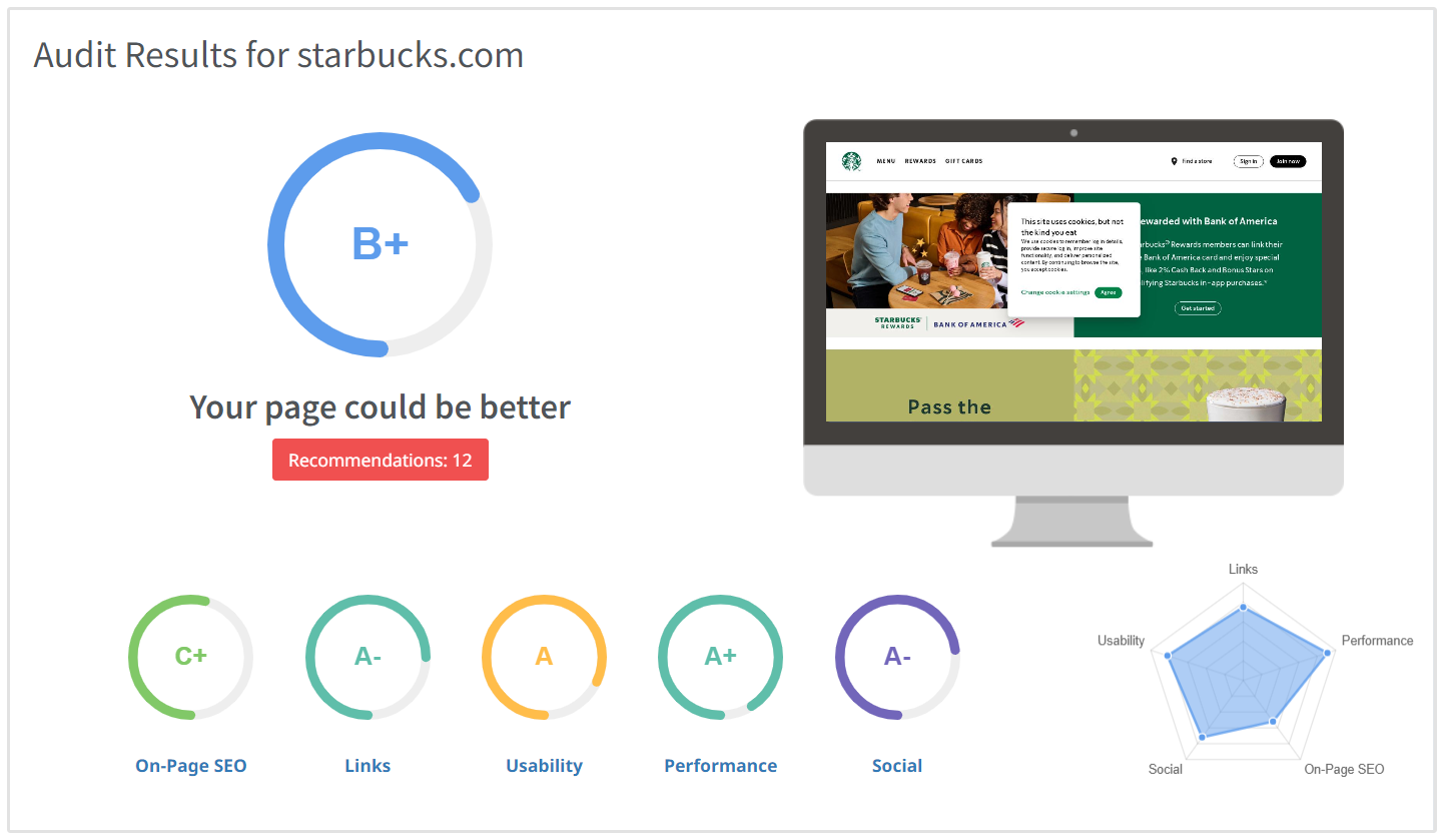 Web sitenizin Bağlantı profilini, Sayfa İçi SEO'yu, Kullanılabilirliği, Performansı ve sitenizin birkaç diğer önemli SEO yönünü kapsayan gerçek zamanlı bir anlık görüntüsünü sağlar.