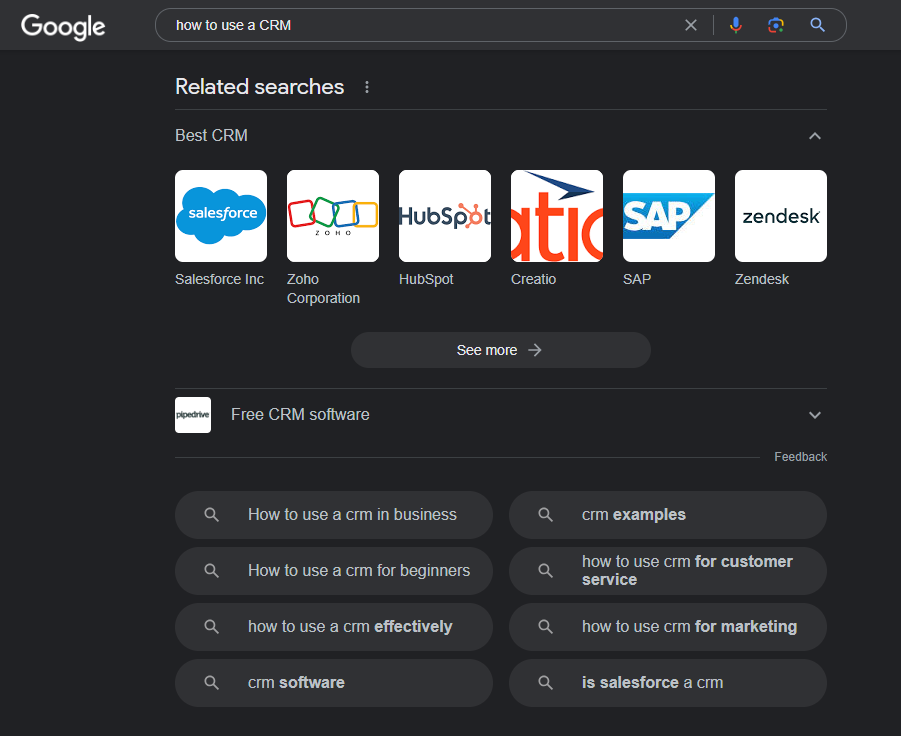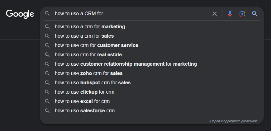 Örneğin, “bir CRM'i nasıl kullanırım” anahtar kelimesini girdiğimde, Google farklı kullanım durumları için bir CRM kullanımıyla ilgili otomatik tamamlama önerileri listesi gösterir: