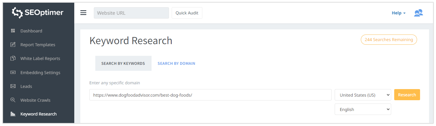 SEOptimer Anahtar Kelime Araştırma Aracı, aylık arama hacimleri, CPC ve rekabet seviyeleri hakkında bilgiler sağlayan etkili bir anahtar kelime araştırma aracıdır.