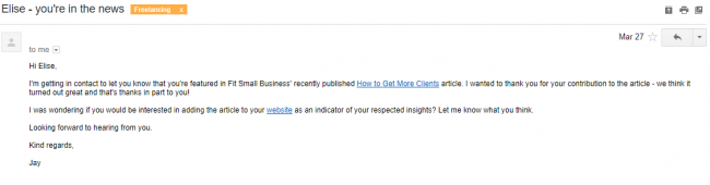 HARO isteğine yukarıdaki adımda paylaştığım gibi katıldığımda, Fit Small Business bana ulaştı ve kendi sitemden blog yazısına link verip vermeyeceğimi sordu: