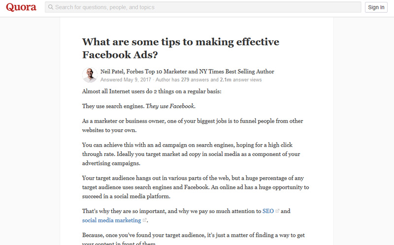 Yani, bir profesyonel gibi Quora yanıtları yazmayı öğrenin! İyi bir örnek için Neil Patel'i görün: