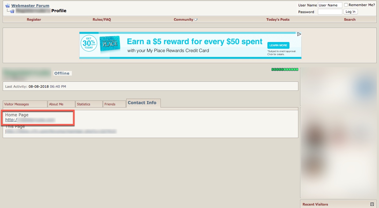 Bu, bir foruma katıldıktan sonra oluşturulan profil sayfanızdır. Neredeyse tüm forumlar böyle bir sayfaya sahiptir ve belirli bir bölüme web sitenizin URL'sini girmenize izin verir:
