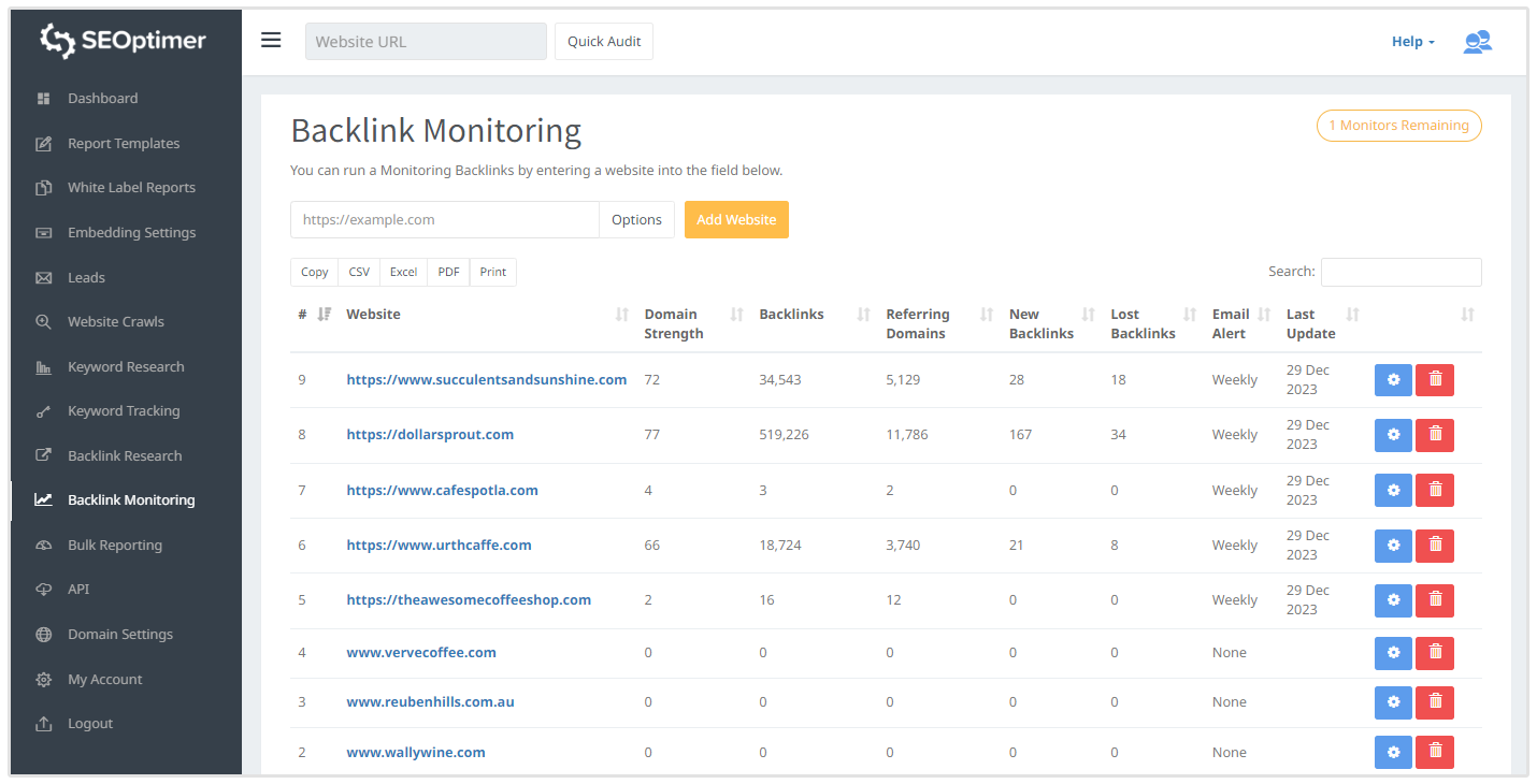 Yazılımı kullanmaya başladığınızdan beri durumu değişen geri bağlantıların detaylı bir listesini tutar ve listeyi her hafta günceller.