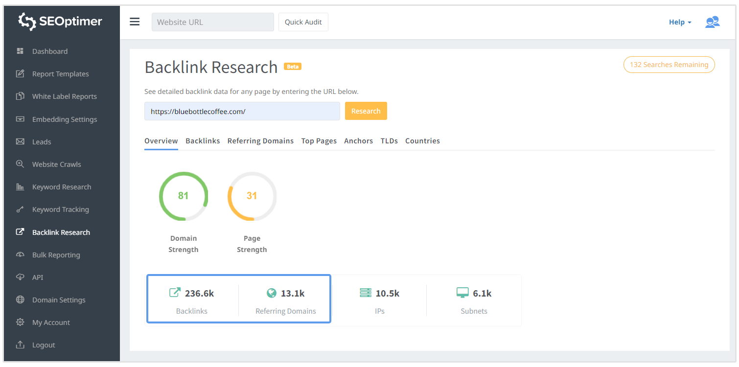 Bir web sitesinin geri bağlantılarını ve yönlendiren alan adlarını SEOptimer'ın Backlink Araştırma aracı kullanarak kontrol edebilirsiniz.