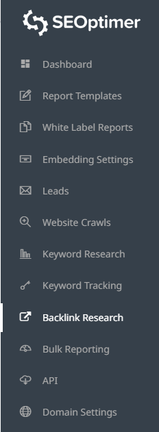 SEOptimer hesabınıza basitçe giriş yapın ve kontrol panelinin sol tarafındaki “Backlink Araştırması” sekmesine tıklayın.