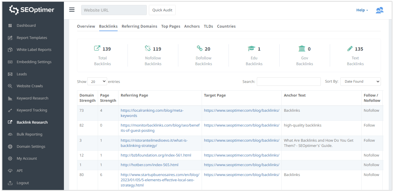Rakibinizin bağlantı profilini SEOptimer backlink araştırma aracını kullanarak çekin.