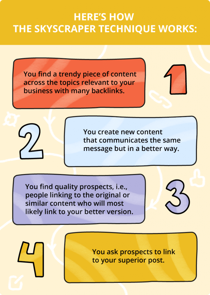 - Skyscraper Tekniği, daha ayrıntılı içerik yazarak en iyi performans gösteren bir sayfayı geride bırakmayı ve aynı (veya daha iyi) geri bağlantıları kazanmayı içerir.