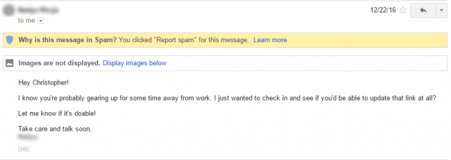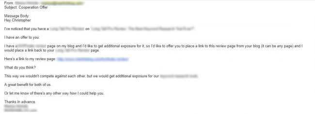 Yukarıdaki örnekte, blog yazarının kaynak sayfasının bana ve izleyicilerime sağlayacağı değeri düşündüğü açık. Çok mantıklı bir teklif yapıyor ve fikrinin sayfalarımıza getireceği SEO avantajlarını açıklıyor. Ayrıca, sitemde bağlantı vermemi istediği sayfa anlamlı ve okuyucularıma değer katıyor.