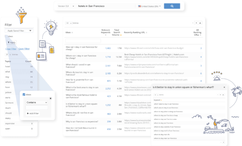 Ancak kendi içeriğinizi şirket içinde geliştirmek istiyorsanız, seoClarity'nin İçerik Fikirleri ürünü fikir üretme sürecinizi hızlandıracaktır. İçerik Fikirleri, Google'ın "İnsanlar Ayrıca Şunu da Sordu" bölümünün en büyük veri setidir. Araç, doğal dil işleme (NLP) kullanarak bağlamı tanır ve kullanıcılara, Google'da gerçekleştirilen gerçek aramalara dayanarak yüksek değerli anahtar kelimeler, uzun kuyruklu fırsatlar ve trend konular sunar: