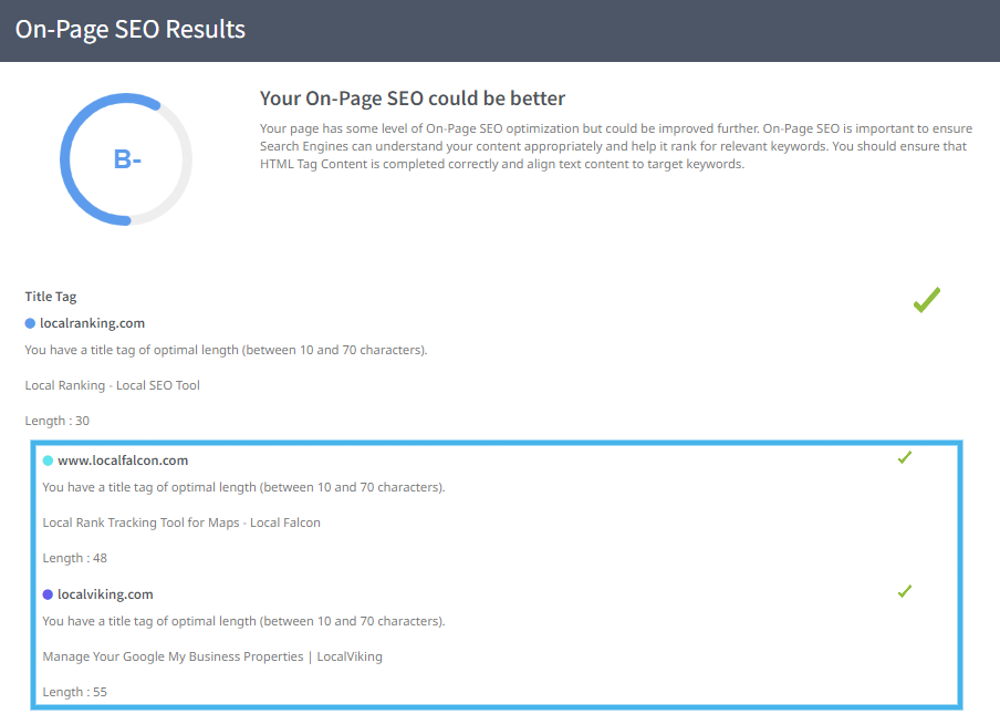 Rakiplerinizin kullandığı optimizasyon taktiklerini ortaya çıkarmak ve web sitenizi onlarınkiyle karşılaştırmak için SEO denetim aracımız gibi otomatik bir araç da kullanabilirsiniz.
