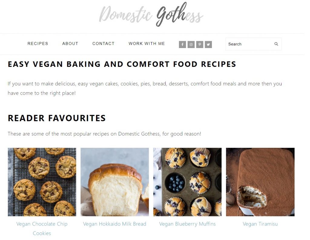 Örneğin, vegan yemek blogunuz varsa, nişe özgü organik trafik elde etmek için ‘vegan’ kelimesini içeren anahtar kelimeleri hedefleyebilirsiniz. Domestic Gothess veganları hedefleyen nişe özgü bir yemek blogunun güzel bir örneğidir.