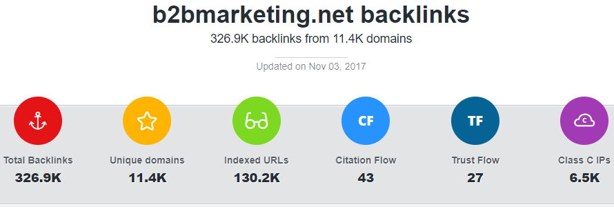 Örneğin, bu aracı kullanarak B2B Pazarlama Dizini'ni kontrol ettiğimizde, iyi kurulmuş bir görünüme sahip olduğunu ve iyi Alıntı Akışı ve Güven Akışı puanlarına sahip olduğunu görüyoruz: