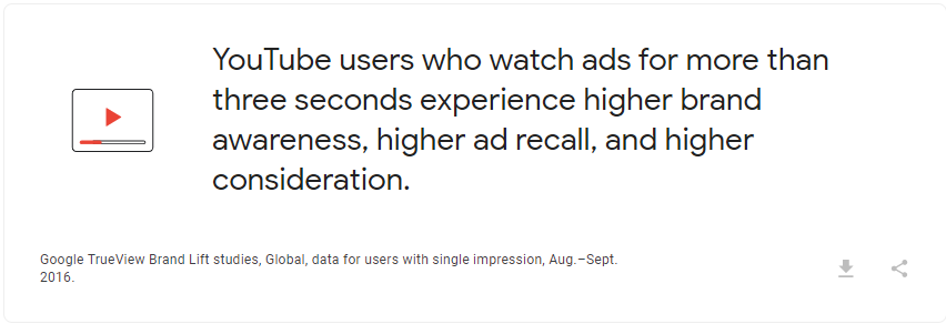 Google TrueView'a göre,Google TrueView, YouTube izleyicileri, bir markanın reklamını üç saniyeden uzun süre izlediklerinde daha yüksek marka farkındalığı, reklam hatırlama ve marka değerlendirmesi gösterirler.