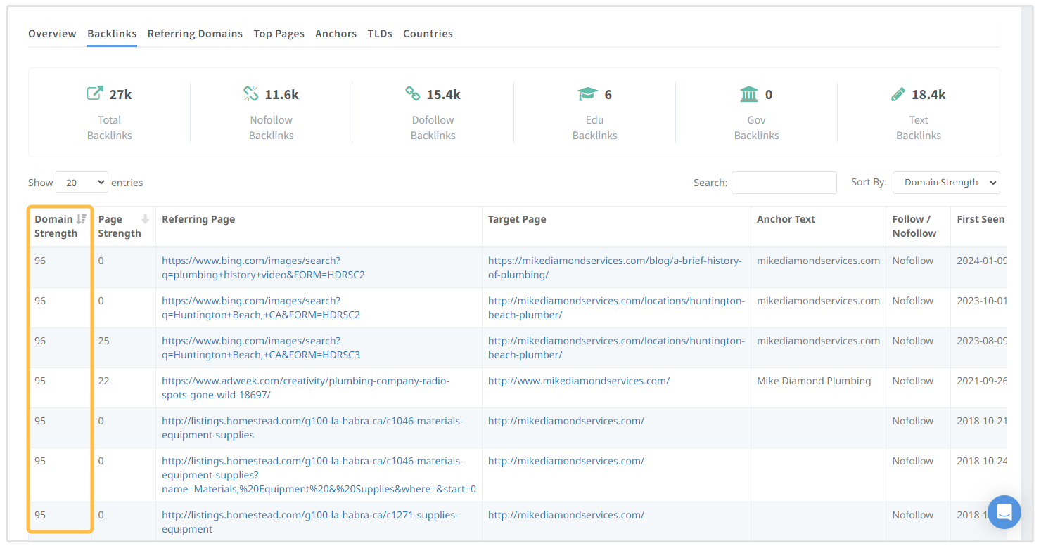 Düşük kaliteli bağlantıları kontrol etmek için Domain Güçlerine bakabilirsiniz. Bunun için, backlink listesini en düşük Domain Gücünden en yükseğe doğru sıralayın.