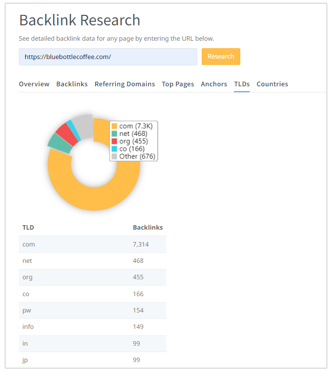 İngilizce bir web sitesinin İngilizce olmayan web sitelerinden çok sayıda bağlantı çekmesi çok nadirdir. Web sitenize bağlantı veren tüm TLD'leri bulmak için, Backlink Research aracındaki "TLDs" sekmesine gidin. Burada, web sitenize bağlantı veren TLD'lerin bir dökümünü alacaksınız.