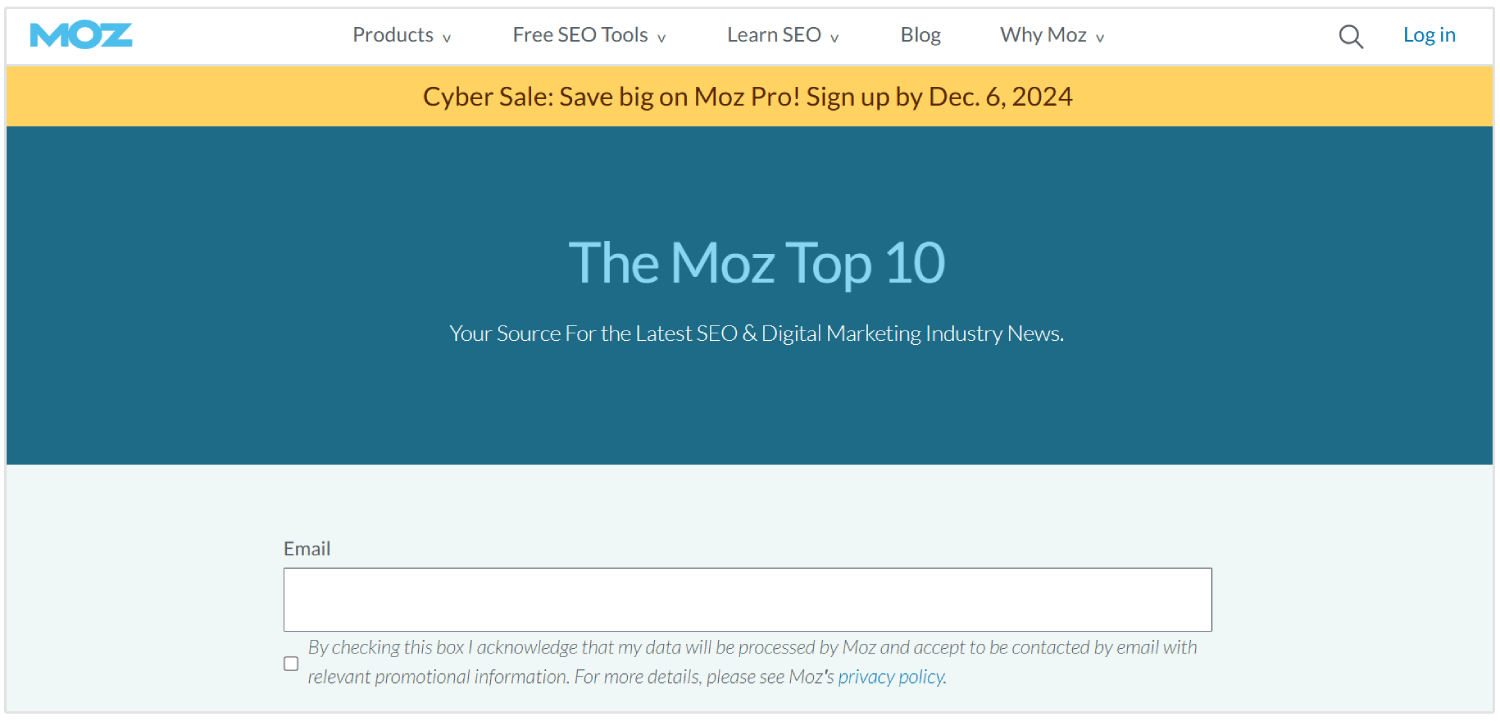 Moz'un bülteni, arama taktiklerinizi geliştirmek için güncel SEO ve dijital pazarlama haberlerini sunan en uzun soluklu SEO bültenlerinden biridir.