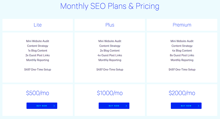 SEO ajansı, Loganix, ayda 500 dolar başlayan fiyatlarla maliyet etkin SEO planları sunar; bu planlar bir blog yazısı, 2x misafir gönderi bağlantıları ve diğer temel SEO hizmetlerini içerir: