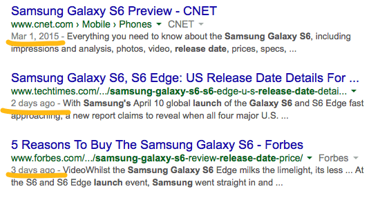Google, özellikle tarihlerin önemli olduğu aramalarda, arama sonuçlarında tarihleri vurgulamaya başladı.